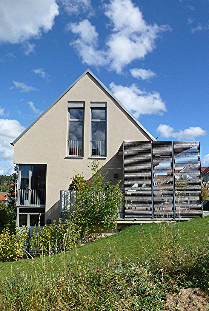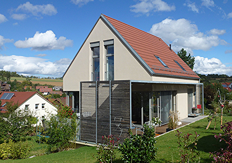 Die vorgestellte Stahl-Konstruktion mit Holzlamellen dient als Verschattungselement und sorgt für eine hohe Wohn- und Lebensqualität, indem sie einen zusätzlichen halbgeschlossenen Raum schafft, der im Sommer einen willkommenen Schattenplatz bietet und im Winter für zusätzliche Privatheit im Innenbereich sorgt.