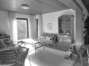 Die dunkle Holzverkleidung an den Decken verschwindet und die Räume wirkenmit den weißen Decken hell und frisch. Die Vergrößerung der Fenstertüre bringt mehr Licht in den Raum und stellt den