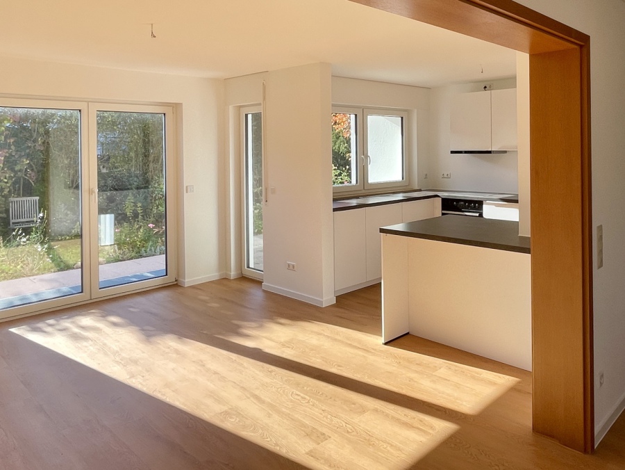 Wo vorher zwei beengte Räume waren, ergibt sich nun ein moderner offener Raumfluss. Der Wohnbereich vergrößert sich dadurch spürbar. Die alte Küche wird durch eine neue Wohnküche ersetzt.